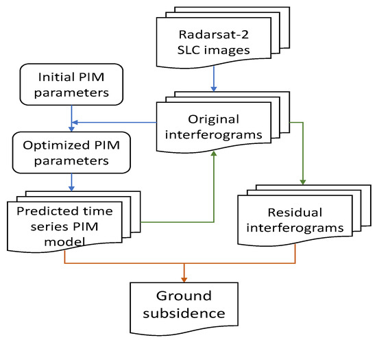 In this paper, a method is proposed to increase the accuracy of PSI monitoring of large gradient deformations by reducing the fringes of the interferograms, as shown in Figure 2. The differential interferograms are referred to as original interferograms. The subsidence maps generated by the PIM model are called the model-simulated maps. The proposed approach mainly consists of three steps: (a) optimizing the adjustment of the model parameters using individually all or a subset of the original interferograms and then generating model simulated maps; (b) removing or reducing the deformation fringes in all interferograms with the simulated maps; and (c) PSI processing the cleaned interferograms, obtaining the residual deformation not considered by the model, and finally generating the deformation time-series adding the model-simulated maps to the calculated residual deformations.