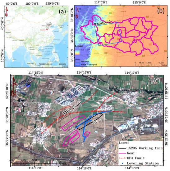 Study area overview: (a) shows the location of the study area. (b) shows the coverage of RADARSAT-2 images and the altitude of the study area. (c) shows the goafs, working faces, faults, and leveling stations. The numbers around the blue points indicate the name of the leveling station.