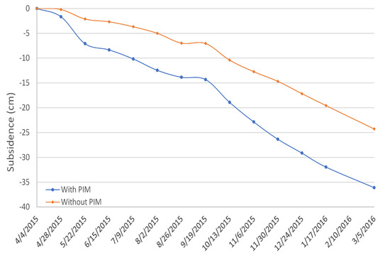 A comparison of the time-series deformation obtained with the two methods in the location with the maximum subsidence velocity is shown in Figure 6. As it can be seen, the two time-series present the same trend, but it is steepest when using the subsidence model. They both have a slowly deformation rate tending to stabilization from 26 August to 19 September 2015. When the subsidence accelerates, from 19 September 2015 to 15 March 2016, the orange curve is almost a line, while the blue one shows that the subsidence rate starts to slow down. The behaviour of the blue line is consistent with the law of sinking after the surface point is affected by underlying mining. The deformation time-series are better retrieved thanks to the fringe reduction provided by PIM, which considers nonlinear deformation.