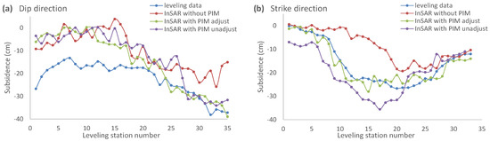 The deformations obtained by PSI with and without PIM assistance are compared with leveling data in Figure 7. In the plots, the deformation retrieved with PIM without parameter optimization [23] is also included for comparison purposes. In order to be consistent with the leveling data, the deformation results have been transformed from the LOS to vertical directions. As the subsidence measured by leveling is from 24 April 2015 to 4 March 2016, the deformation monitored by PSI has been limited to the period from 28 April 2015 to 5 March 2016. It can be seen that the green and purple curves, PSI with PIM, decrease faster than the red one, PSI with no model, in both the dip and strike directions. This is because, compared to traditional PSI, PIM reduces the number of interferometric fringes in the sinking area, that is, the phase gradient. Thus, as the phase ambiguity of the relationship among PS points is reduced, the network is more robust. Moreover, part of the deformation is a priori retrieved by the external model. Therefore, PSI processing can achieve better results.
