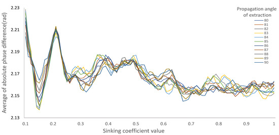 In order to understand the effect of the parameters in the final results, Figure 8 shows the relationship between the error factor (as mentioned in Section 2.3, the average of the absolute values of the phase differences) and the sinking coefficient when the propagation angle of extraction changes. The searching range is expanded to 0∼1, and the step size is reduced to 0.01. It can be seen that, as the sinking coefficient increases, the factor gradually decreases and its fluctuation becomes smaller. Taking the curve of the propagation angle of extraction of 90 as an example, the minimum values are obtained periodically at 0.15, 0.32, and 0.67, respectively. This periodic phenomenon is due to the use of the wrapped phase for verification. The sinking coefficient controls the subsidence value; after transforming subsidence into the wrapped phase, the simulated deformation from the integer multiples values will have similar phases. Therefore, once one value of sinking coefficient can minimize the error factor, its integer multiples. This miscalculation can be avoided by setting the minimum estimated sinking coefficient as the final optimized result.