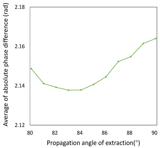 When the propagation angle of extraction is 83, the sinking coefficient which minimizes the error factor is 0.15. Figure 9 shows the relationship between the error factor and the propagation angle of extraction when the sinking coefficient is 0.15. It can be seen that, as the propagation angle of extraction increases, the error factor first decreases and then increases and the minimum value is obtained when the mining influence propagation angle is 83. It is worth noting that, in Figure 8, not all curves are at their minimum value when the sinking coefficient is 0.15. For example, when the mining influence propagation angle is 89, the sinking coefficient that minimizes the average of the phase difference is 0.68. When the propagation angle is 90, the sinking coefficient which minimizes the average value of the phase difference is 0.67. It is indicated that the optimal value of one parameter is affected by other parameters, which is why the brute force is used in this paper to optimize all values at the same time instead of determining the optimal parameters in turn, although that would cause a lower computational burden.
