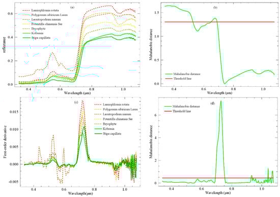 - Lin, H.-J.; Zhang, H.-F.; Gao, Y.-Q.; Li, X.; Yang, F.; Zhou, Y.-F. Mahalanobis distance based hyperspectral characteristic discrimination of leaves of different desert tree species. Guang Pu Xue Yu Guang Pu Fen Xi = Guang Pu 2014, 34, 3358–3362. [Google Scholar]