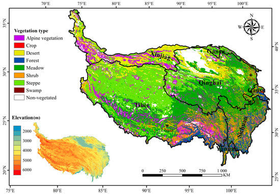 The QTP is located in southwestern China, which covers an area of >2.5 million km2. It encompasses most of Tibet and Qinghai Province, and parts of Xinjiang, Gansu, Sichuan, and Yunnan provinces (Figure 1). The mean elevation of the QTP is more than 4000 m [7], which makes the plateau colder than any other regions at the same latitude [68]. In most of the QTP, the mean annual temperature is <0 °C, and the annual accumulated temperature >10 °C is <2000 °C [69]. The mean annual precipitation across the plateau is < 400 mm, which decreases from the southeast to the northwest with notable spatial difference [6]. Areas of forest and shrub are distributed mostly in the southeast of the plateau, while the desert is found primarily in northwestern areas of the QTP. As the two principal vegetation types, meadow and steppe occupy more than half the area of the plateau.