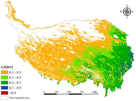 During 2000–2019, the mean GNDVI in the whole QTP was 0.3201, showing a decreasing trend from east to west (Figure 2). The sparse and non-vegetated areas (<0.1) occupied 30.74% of the whole plateau area, mainly including the Qaidam Basin in the north and the Kunlun Mountains in the northwest. For vegetated areas, the areal proportions of different GNDVI levels were 2.22% (>0.7), 20.36% (0.5–0.7), 22.72% (0.3–0.5), and 54.70% (0.1–0.3), respectively.