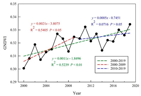 In addition, during a relatively long study period, the dynamics of vegetation in different time periods are likely to show different trends. Therefore, in the process of the GNDVI dynamic analysis and correlation analysis, we divided the study period into three time periods so that we can understand the dynamics of vegetation in different periods: The whole study period (2000–2019), the first decade (2000–2009) and the second decade (2010–2019).
