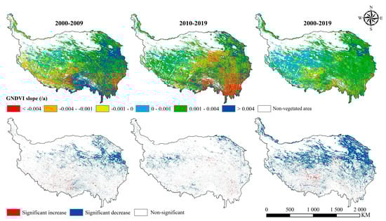 The spatial patterns of the GNDVI trend on the QTP. The figures above show the GNDVI slope in different periods, and the figures below show the corresponding significance of the GNDVI slope.