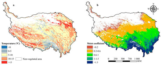 The perennial mean (a) temperature and (b) moist coefficient in the growing season of the vegetated areas during 2000–2019.