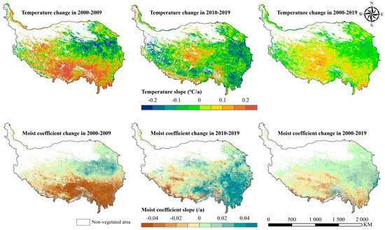 In the past 20 years, the mean temperature in the growing season across the whole QTP showed a significant increasing trend (p < 0.05) with a rate of 0.0229 ℃/a, among which 65.65% of vegetated areas showed an increasing trend in temperature, while 34.35% showed a decreasing trend (Table 3). The cooling areas were mainly distributed in the northeast, mid-east, and western edge of the plateau, and the most cooling area was in the south of the Qinghai Lake. In contrast, the warming areas included the mid-west, southwest, and southeast of the plateau, especially the Nagqu Prefecture in northern Tibet (Figure 6). The moist coefficient in the growing season across the whole QTP showed a slightly increasing trend (p > 0.05) with a rate of 0.0038/a, indicating that the water supply was basically stable during the study period. The areas of increasing moist coefficient were mainly in the northeast of the plateau, accounting for 59.61% of the vegetated areas, while the decreasing areas were mainly in the southwest and southeast of the plateau, accounting for 40.39%. On the whole, western and southeastern parts of the QTP were warming and drying, while most other areas were warming and wetting during the study period.