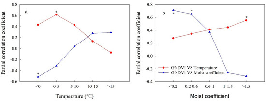 The partial correlation coefficient between the GNDVI and climatic factors under different conditions of (a) temperature and (b) moisture on the QTP during 2000–2019. * p <0.05.