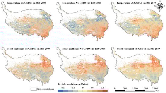 Due to the great spatial heterogeneity of the climatic conditions on the QTP, the response of vegetation to climatic factors also had a strong spatial difference. During 2000–2019, the partial correlation coefficient between the GNDVI and temperature was negative for 46.41% pixels (8.16% significantly with p < 0.05), and positive for 53.59% pixels (11.60% significantly with p < 0.05) (Table 4). The positive correlation pixels were mainly distributed in the northeast and southwest of the plateau, while the negative correlation pixels were mainly distributed in the central and southeast of the plateau (Figure 8). The spatial pattern of the partial correlation coefficient between the GNDVI and moist coefficient showed a significant north-south difference. The positive correlation pixels were mainly distributed in the north of the plateau, accounting for 58.33% of total pixels (13.77% significantly with p < 0.05), while that negative correlation pixels were mainly distributed in the south, accounting for 41.67% of total pixels (4.95% significantly with p < 0.05). In different decades, the spatial pattern of the partial correlation coefficient between temperature and moist coefficient was basically consistent, except for some parts of the North Tibet Plateau, and the areal proportion of different partial correlation levels between the GNDVI and temperature and moist coefficient also did not change significantly over different decades (Table 4). Both phenomena suggested that the response mechanism of vegetation to climate change has not changed significantly in most areas of the QTP. In the North Tibet Plateau, the positive correlation between the temperature and GNDVI decreased, while the positive correlation between the moisture and GNDVI increased, which meant that available water gradually replaces temperature as the main factor affecting vegetation growth. This transformation might be associated with the lack of water, causing by the continuous climate warming and drying in this region.
