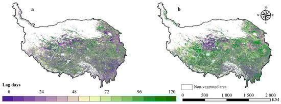 The spatial distribution of climatic factor’s time lag at which the maximum partial correlation coefficient between the GNDVI and (a) temperature and (b) moist coefficient on the QTP during 2000–2019.