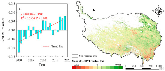 (a) The GDNVI residual variation of the whole QTP and (b) its spatial pattern during 2000–2019.