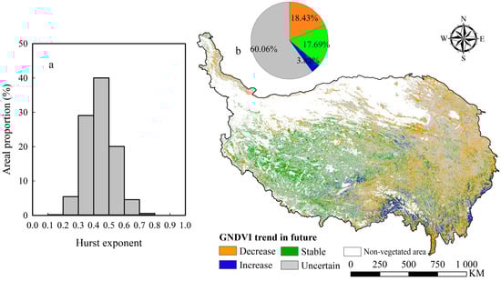 (a) The areal proportion of different Hurst exponent levels and (b) spatial distribution of future vegetation trends on the QTP.
