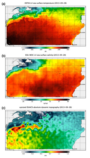 The SSS data were developed within ESA-WOC project [44]. They were obtained by adapting to the 1/10° North Atlantic grid the multidimensional optimal interpolation algorithm used to retrieve CMEMS global dataset (http://marine.copernicus.eu/services-portfolio/access-to-products/, product_id: MULTIOBS_GLO_PHY_REP_015_002, dataset_id: dataset-sss-ssd-rep-weekly). This algorithm interpolates SMOS observations and in situ SSS observations considering a space–time-thermal decorrelation function, estimated by including information from high-pass filtered daily SST data [45,46]. This multivariate approach effectively increases the SSS resolution by using satellite SST differences to constrain the surface patterns (see Figure 1b). Here, we ingested the SMOS L3OS 2Q debiased daily salinity disseminated by the Centre Aval de Traitement des Données SMOS (CATDS, 2017), OSTIA SST data and CORA5.2 surface values (see Section 2.2) as input data, and used the CMEMS weekly SSS dataset to build our background field (linearly interpolating it in time between the 1/10° grid through a cubic spline). All other interpolation parameters were set as in [47].