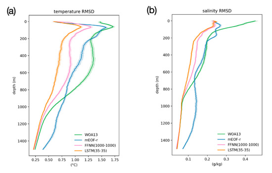 RMSD between temperature (a) and salinity (b) climatological and reconstructed profiles, estimated from independent test data. RMSD confidence intervals (one , displayed here as shadowed areas) have been estimated through a Monte Carlo approach—i.e., as the standard deviation of the statistics computed from 1000 resampling with replacement [58].