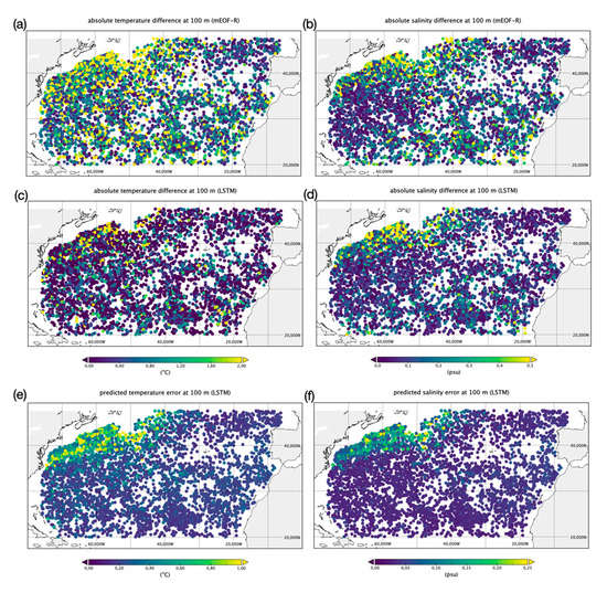 Absolute value of the differences between mEOF-r temperature (a) and salinity (b) and observed test data at 100 m depth, and corresponding LSTM (35–35) differences (c,d). Temperature (e) and salinity (f) predicted LSTM (35–35) reconstruction error at 100 m.