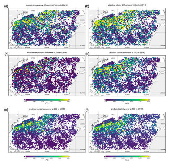 Absolute value of the differences between mEOF-r temperature (a) and salinity (b) and observed test data at 500 m depth, and corresponding LSTM (35–35) differences (c,d). Temperature (e) and salinity (f) predicted LSTM (35–35) reconstruction error at 500 m.