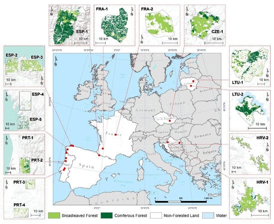 The MSF forest mask layers used on this study were implemented on sixteen case demos in six countries and include the most representative forest types across Europe (Figure 1). These Areas of Interest (AOI) are managed by forest owners’ associations and forestry research institutes which promote conservation and sustainable management values in over one million hectares in size. For simplicity, each AOI has an acronym related to the country (e.g., Spain is ESP) and the number of AOI present in each country.