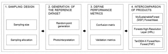 Considering the difficulties of using cross-validation and national forest inventories for our objectives, a new reference forest/non-forest dataset was generated by an independent operator to validate MSF forest masks and compare it with the other external products (e.g., HRL and FNF). The validation strategy was divided into four phases: (1) sampling design; (2) generation of the reference dataset through visual interpretation; (3) definition of performance metrics; and (4) intercomparison of products. The methods explained in subsequent sections are summarized in the flowchart (Figure 2).