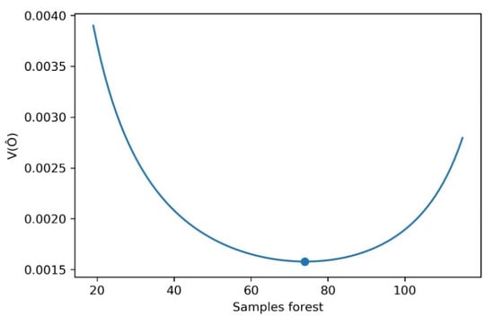Changes in the variance of the overall accuracy (V(Ô)) depending on the number of samples assigned to the forest class for the AOI ESP-1. The optimal number of forest samples to minimize the variance was 73.