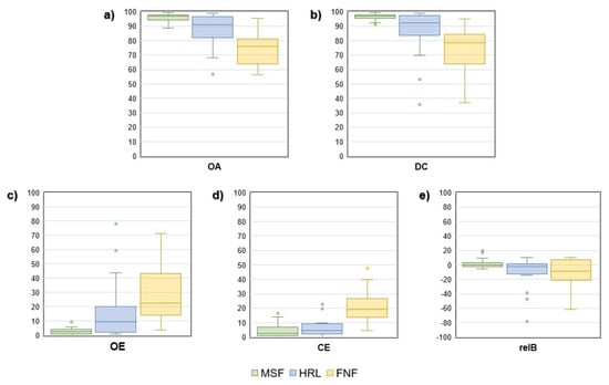 The IQROE (Table 6 and Figure 4) was higher in FNF (22.9%), followed by HRL (13.48%) and MSF (2.65%). The IQRCE showed a similar behavior, being higher in FNF (8.83%) followed by HRL (6.73%) and finally MSF (4.3%). It should be noted that forest omissions were much higher than commissions in the case of HRL and FNF products. On the other hand, in MSF, the commission was greater than the omission, even though they achieved a great balance. The medians were lower than 10% for the MSF forest mask (OE = 2.5% and CE = 2.7%) and HRL (OE = 9.25% and CE = 4.6%), and it was around 20% in the case of FNF (OE = 22.6% and CE = 19.2%). The relative bias was higher for FNF and HRL than for MSF, highlighting more imbalanced errors. This fact was reinforced by the relatively high dispersion of relB in FNF and HRL. While for MSF the range of relB is 16.3, with areas with relB = 0%, the range of this metric reaches 88.3 for HRL and 71.9 for FNF. The low IQRs of MSF confirmed its consistent performance in forests with different characteristics compared to the other products analyzed.