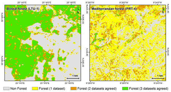 External validations were carried out by local stakeholders within MSF project. ESP-2, ESP-3, ESP-4 and ESP-5, located in northwestern Spain, reported accuracies ranging between 93% and 100%. However, these AOIs were validated with sets of 8, 14, 31 and 20 points, making the final accuracy not significant enough. LTU-1 reported an overall accuracy of 90.4% and a kappa coefficient (k) [] of 0.80 comparing MSF forest mask with information from the Lithuanian National Forest Inventory. The OA given by external stakeholders in this case is 10% lower than the OA achieved in this study. For LTU-2, the difference was lower (external OA = 91.1%; external k = 0.82). FRA-1 and FRA-2 were validated by stakeholders using non-systematic visual field control, reporting accuracies of 90% for both areas, around 8% below the OA found in this work. Stakeholders from CZE-1 reported an accuracy of more than 95% through visual inspection using high resolution ortophotos and cadaster data. In this last case, the difference with our OA was under 2%. At the time of writing this article, local validation from Portuguese and Croatian stakeholders is still pending, being the former particularly interesting to compare as it was clearly the most problematic area. However, the results of these external validations are hard to interpret and compare given the variability of methods and data sources used to carry out the accuracy assessments. The differences between the independent validation here presented and the external validation carried out by local stakeholders may be explained by two main points. Firstly, local forestry institutions are not always used to deal with continuous remote sensing data (i.e., based on pixels). Hence, these institutions may not have clearly defined validation protocols for this type of products, leading to several problems such as under-sampling or not taking into account the confidence level or standard error of the metrics computed for a certain area of interest. Secondly, the main purpose of local institutions may differ. Within the MSF project consortium, some institutions were centered in public forest management at national scale (e.g., CFRI), while others were associations of private owners (e.g., FORESNA) or privately owned companies with specific objectives (e.g., RAIZ is part of the pulp industry, while MADERA+ is focused on wood technological properties). This fact, together with the different nationalities involved, led to different definition of forests depending on national forest inventories or other sources. These considerations led to significantly different external validation approaches, which highlighted the need of standard definitions and methods to validate remote sensing-based forestry products, as the protocol proposed in this study.