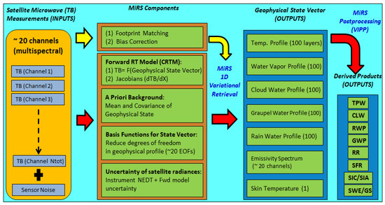 The Microwave Integrated Retrieval System (MiRS, https://www.star.nesdis.noaa.gov/mirs) has been the official operational microwave retrieval algorithm of the National Oceanic and Atmospheric Administration (NOAA) since 2007. Compared to visible and infrared radiation, microwaves have a longer wavelength, and thus can penetrate through the atmosphere more effectively. This feature allows microwave observations under almost all weather conditions, including in cloudy and rainy atmospheres. MiRS follows a one-dimensional variational (1DVAR) methodology [1,2]. The inversion is an iterative physical algorithm in which the fundamental physical attributes affecting the microwave observations are retrieved physically, including the profiles of atmospheric temperature, water vapor, non-precipitating cloud, hydrometeors, as well as surface emissivity and skin temperature [3]. The Joint Center for Satellite Data Assimilation (JCSDA) Community Radiative Transfer Model (CRTM) [4,5] is used as the forward and Jacobian operator to simulate the radiances at each iteration prior to fitting the measurements to within the combined instrument and forward model noise level. After the core parameters of the state vector are retrieved in the 1DVAR step, an additional post-processing is performed to retrieve derived parameters based on inputs from the core 1DVAR retrieval. The post processing products include total precipitable water (TPW), snow water equivalent (SWE), snowfall rate (SFR), surface precipitation rate, etc. [6]