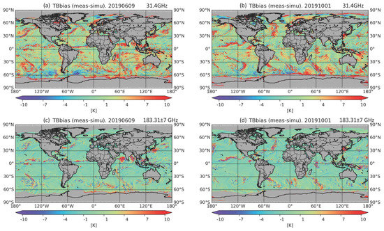 Global brightness temperature measurements minus simulations [K] over ocean, for 9 June 2019 at 31.4 GHz and 183.31 ± 7 GHz frequencies (a,c), and similarly for 1 October 2019 (b,d).