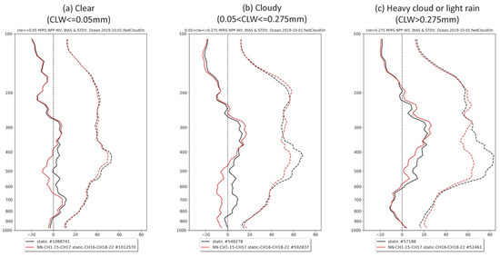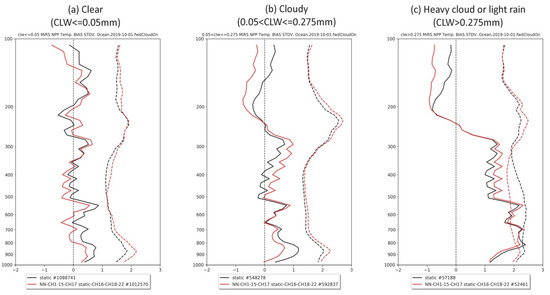 MiRS temperature profiles (K) validated with ECMWF analyses for SNPP/ATMS over ocean for (a) clear, (b) cloudy, and (c) heavy cloud or light rain conditions on 1 October 2019. The black lines are for MiRS using the static bias correction method, and red for the NN bias correction method. Solid lines are for bias, and dashed lines for standard deviation.