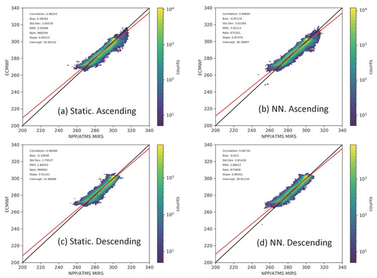 Results for performance metrics of descending node are similar to Table 3 except for Tskin, which has strong diurnal cycle. In Figure 9, MiRS Tskin retrievals are verified with ECMWF analyses and shown by density scatterplots. Tskin for static (left) and NN (right) are shown for both ascending (top) and descending (bottom) nodes. In ascending node, the bias from NN decreases from ~0.4 K to ~0.1 K. However, in descending node, the bias increases from ~−0.2 K to −0.6 K.