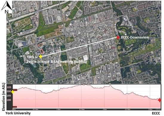 The field campaign was conducted in northwestern Toronto, which is comprised of relatively flat terrain and low-, mid-, and high-rise residential, commercial, and industrial buildings. Several large parks and one major highway (highway 407) are located within the region, which is ~17 km north of Lake Ontario. Figure 1 shows the locations of the York University campus and the ECCC Downsview office, which are separated by 3.2 km. Fast-moving meteorological events such as passing fronts and deep-penetrating lake breezes, which are detectable by lidar-based technologies [21], frequently occur at the site during the summer and provide opportunities to measure sharp vertical gradients in the water vapor structure.