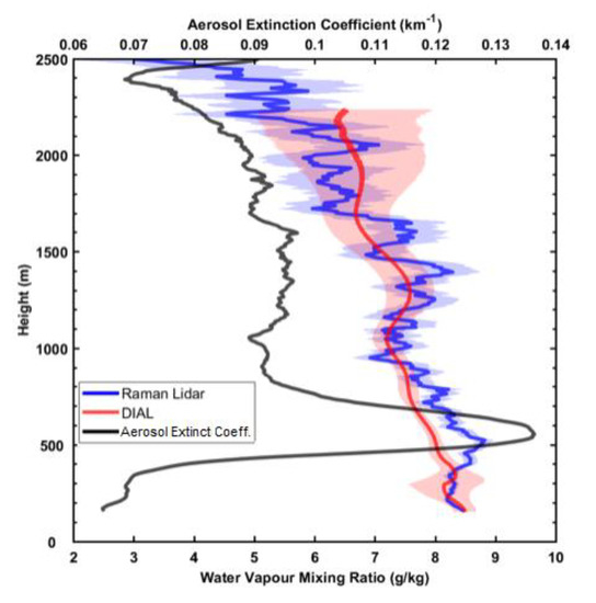 The night of July 10/11 provided a comparison between the Vaisala DIAL and York Raman lidars when the atmospheric conditions were not changing rapidly. Figure 3 shows a 20-min average of the water vapor mixing ratio profile measured with both lidars and the aerosol optical extinction coefficient measured by the Raman lidar during clear skies and constant meteorological conditions. There was a difference of ~0.8 g/kg in the water vapor mixing ratio where there was a distinct aerosol layer at around 600 m AGL, but the two lidar measurements were within the limits of uncertainty at all other heights up to the DIAL’s maximum effective range (2.23 km AGL) during this scan. During the campaign, the DIAL’s data availability, defined as the percentage of time for which the DIAL provided an observation at that height that passed its quality control (i.e., within its effective range), was ~100% below 500 m AGL, dropping only slightly up to 1400 m AGL. Roughly speaking, 1400 m AGL is typically near the average boundary layer height in Toronto during the summer months [21]. Above this height, the data availability for the DIAL dropped to <10% above 2.5 km AGL. Note that the DIAL has slightly lower maximum range during daytime operation due to solar background radiation [18].