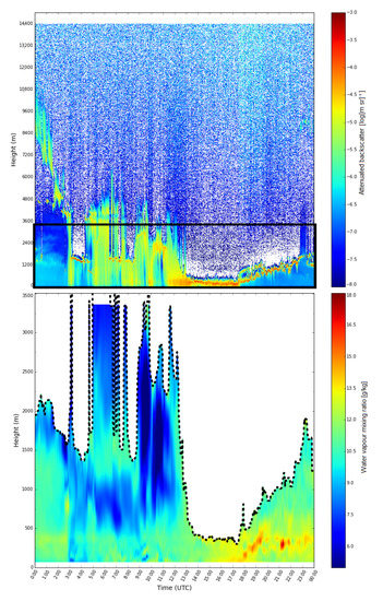 DIAL 1-min backscatter (top) and 20-min averaged water vapour mixing ratio (bottom) profile observations before, during (~3:00 to ~14:00 UTC), and after several rainstorms on 22 July 2018. Note the attenuated backscatter plot (top panel) extends beyond the range of the water vapor plot as indicated by the black box.