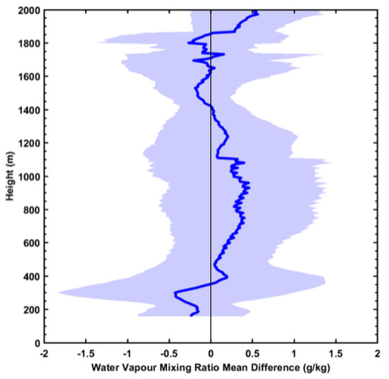 The average difference in the WVMR measurements between the two lidars for all 20-min profiles during the entire campaign (all eight nights) is shown in Figure 6. The mean difference (DIAL–Raman) between the two lidars was 0.17 ± 0.14 g/kg. This indicates excellent agreement between the two lidars given the 3.2 km separation distance and is in close agreement with comparisons performed in the SGP by [18]. A negative bias below 500 m AGL was observed, indicating the DIAL is biased low near the surface and biased high elsewhere (for the most part) compared to the Raman lidar, which was also observed in [18]. The mean difference and standard deviation of the difference peaked around 350 m AGL, which is the region where the DIAL’s near- and far-field units overlap. An updated processing algorithm is in development by Vaisala and is expected to remedy this as well as the slight positive bias throughout the rest of the profile that is caused by an overestimation of the laser spectral width in the retrieval algorithm.