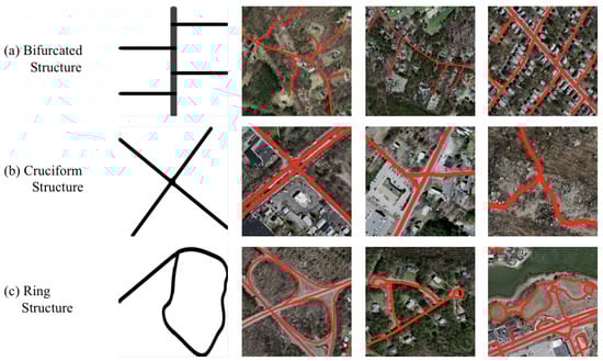 Figure 1, there are three classical topological structures: bifurcated structures, cruciform structures, and ring structures. They all have multiple connected components and decentralized structures in which the feature pixels of the road in the optical remote sensing image are scattered in position. They are different from other cluster features, such as buildings, airplanes, and so on, which is the main feature of linear structures like roads. However, the above methods use image patches as the input of the network; thus, it is difficult for the network to extract different forms of topological structures if the receptive field is too small. Another problem is that to extract the topology and achieve high accuracy, they usually design complex and heavy networks, requiring extensive computing resources and memory consumption. However, for example, in the case of flood [