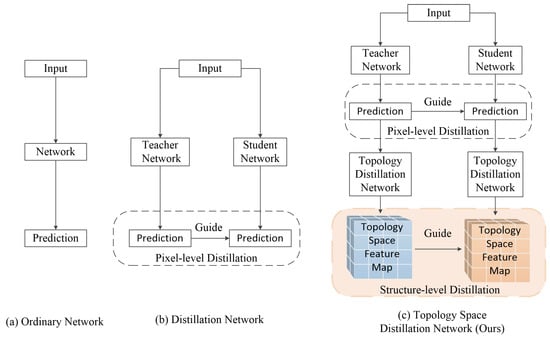 Figure 2c, it distills two kinds of knowledge from the teacher network: the widely used pixel-level feature distillation and a new kind of structure-level knowledge, which is also called the topological space feature. It can achieve the migration of topological space features from a teacher network to a lightweight network. Therefore, it can help the lightweight network summarize the topological information of surrounding pixels and pay attention to key areas, such as intersections. By introducing this, the network can achieve more continuous road detection results.
