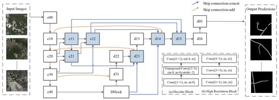 For the task of road extraction, it is hard to get both the high-resolution features and rich semantic information. Furthermore, in remote sensing images, a large part of the road looks short and narrow. The urban branch roads and rural roads have fewer pixels in width, and there are many short roads in the communities of cities. In multiple downsampling operations, semantic information became wealthy, but the location information was reduced a lot. Thus, it has a strong desire for high-resolution spatial information. The encoder–decoder network D-LinkNet has achieved high computational efficiency, but a simple encoder–decoder module cannot satisfy the extraction requirements. Although the multi-stage series–parallel atrous convolution increases the receptive field, it cannot solve the problem of the loss of spatial information caused by multiple downsampling, especially for images with lower resolution. The detailed feature information of the road is complete in the high-resolution layer. As a result, rather than restore high resolution from low resolution, we choose to keep high resolution with more encoder and decoder blocks.