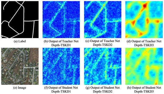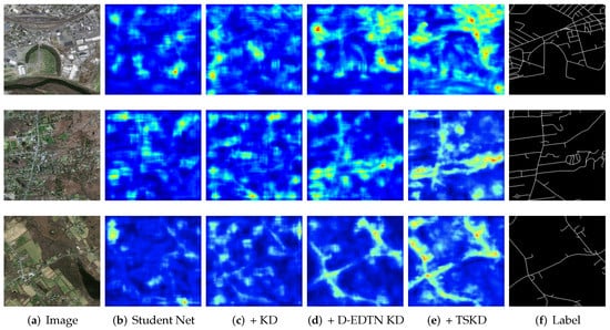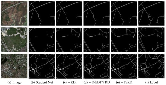 Figure 10c, it is clear to see that the student net with knowledge distillation captures more information than before. Apart from this, with the dense encoder–decoder teacher net (D-EDTN), the student yields better results. This is attributed to our dense model, which can get more detailed information about the narrow and short roads. This also verified the effectiveness of the proposed teacher net in contributing to the student net’s learning more spatial information about the unique scaled road. What is more, by integrating the topological space knowledge distillation (TSKD), the results are the best of all, demonstrating that the topological loss based on distillation is suitable for the road extraction task. As we shall see, with the topological loss, the student net produces a more consistent result, no matter if the roads are long or short.