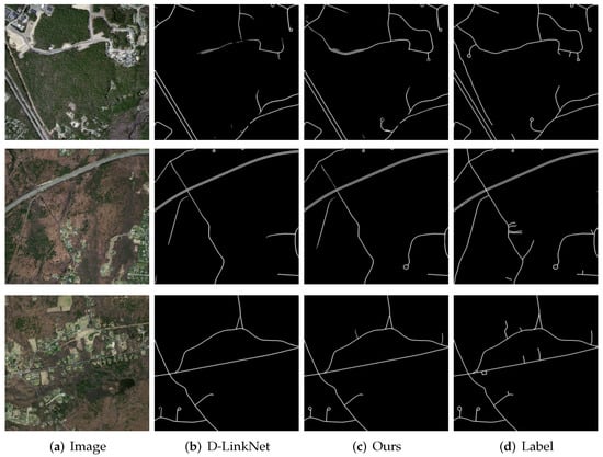 Figure 8, it can be seen that D-LinkNet had high performance due to its substantial center dilation part that expanded the receptive field of convolution. However, it still can not pay attention to the short and narrow roads; with our proposed method, this problem is alleviated. The D-EDTN shows more short and narrow roads in