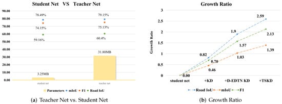 Figure 11a. The student net shows a balanced performance between the parameters and the accuracy. Although it is only one-tenth of the parameter amount of the teacher network, it can still exhibit similar accuracy performance. As for Road IoU, mIoU, and F1 score, as shown in