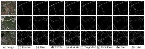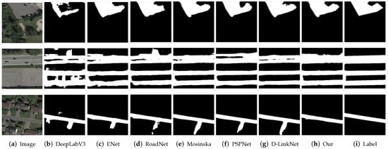 Figure 14b shows that there are serious “salt and pepper” phenomena and wrong segmentation in Deeplabv3, while the ENet, RoadNet, Mosinska’s method, and PSPNet in