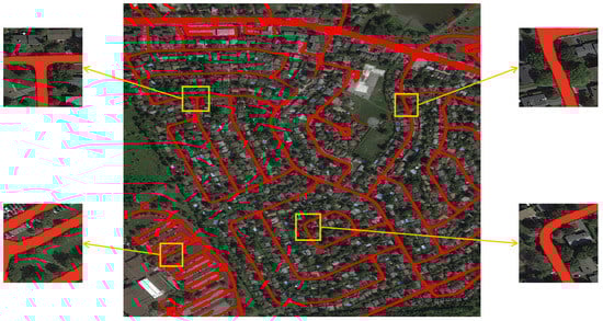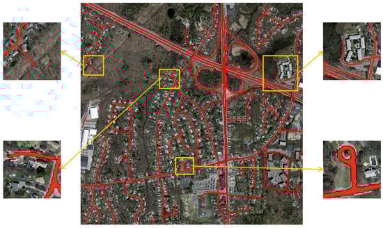 Figure 15 shows the detailed segmentation results of our network. We can see that the underlying topological structure of the road is segmented clearly, especially for the shadow occlusion area. It can be seen in the four enlarged parts of the image that our network can overcome this problem and get the smooth road edges. The above results show that our method can effectively extract the topological structure of the road and overcome the non-obvious road features caused by environmental factors, such as tree shadows.