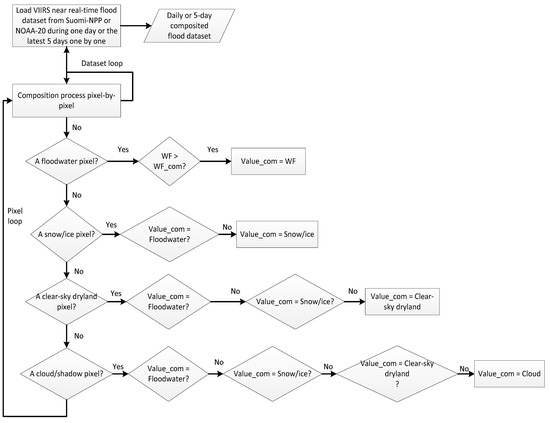 Because VIIRS is an optical sensor, the images may be contaminated by clouds. To filter out cloud cover, a multi-day composition process is applied to derive the maximal flood extent. With the near-real-time (NRT) VIIRS flood maps during a period, a pixel is assigned as a flooding pixel in the composited flood map as long as it is detected as a flooding pixel in any flood map during that period, and the maximum flood water fraction among all the NRT flood maps is used as its composited water fraction. If a pixel is not detected as flood but is detected as dryland in any NRT flood maps, then it is assigned as a dryland pixel in the composited flood map. The composition process is illustrated in Figure 1. In this way, the composited flood map shows the maximal clear-sky coverage with the maximal floodwater fractions during an appointed period.