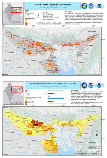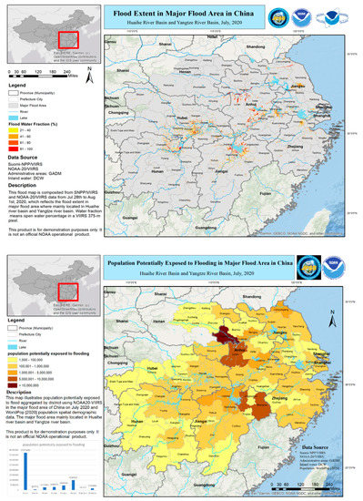 Using a geographic information system (GIS) system, the population cells can be clipped to satellite-derived flood footprints to estimate the ‘population potentially exposed’ (PPE) to flood events [38]. The objective of this study is to map and analyze the catastrophic Asia floods and estimate the affected population in summer 2020 using VIIRS imagery onboard both the S-NPP (Suomi National Polar-Orbiting Partnership) and NOAA-20 polar-orbiting weather satellites. The VIIRS-derived flood footprints will be combined with population databases and ArcGIS (version 10.4.1) for human impact assessment in the catastrophic Asia flood events during summer 2020.