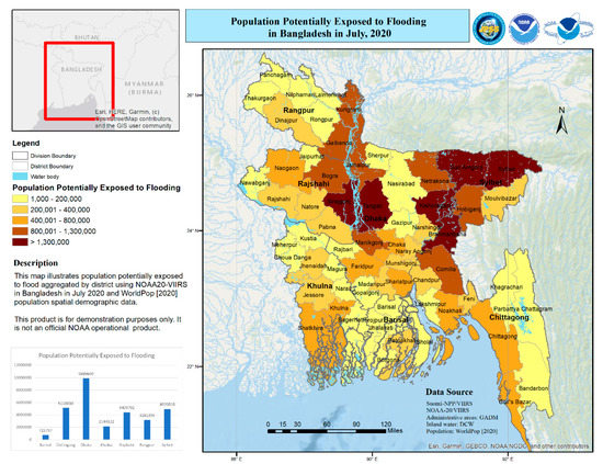 Figure 5 illustrates the potentially exposed population to floods (cumulative) aggregated by district using the NOAA20-VIIRS-derived flood map in Bangladesh between the 22nd and the 26th of July, 2020, and Worldpop spatial demographic data [40]. According to the estimate from the spatial analysis with the ArcGIS, the worst affected districts are mainly located in Dhaka, Sylhet, and Rajshahi divisions, with a PPE of over 1.3 million. According to the estimate, the total population potentially exposed to floods is about 9,889,899 in Dhaka, 5,118,810 in Chittagong, 4,926,018 in Sylhet, 4,409,792 in Rajshahi, 3,181,396 in Rangpur, 2,144,122 in Khulna, and 725,797 in Barisal. About 30 million people in Bangladesh were exposed or living close to flooded areas. The estimated 30 million PPE is much higher than the reported 5.4 million flood victims in Bangladesh [8]. The Bangladesh 2020 population is estimated at 164,689,383 people; if one third of Bangladesh was reported to be underwater in July 2020, the estimated 30 million population potentially exposed to floods should make sense.