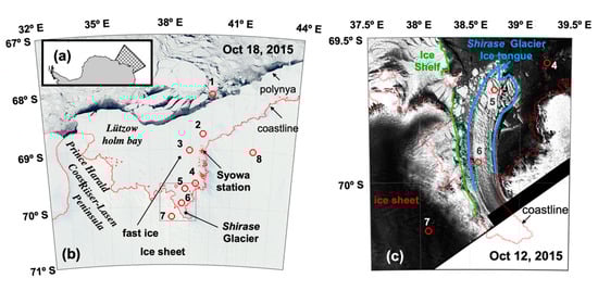 Ice conditions in Lüzow-Holm Bay, East Antarctica, and surrounding areas: (a) Map of eastern Antarctica and (b) an overall view of Lützow-Holm Bay from an Aqua Moderate Resolution Imaging Spectroradiometer (MODIS) image acquired on 18 October 2015. (c) An enlarged view around the Shirase glacier tongue provided by a Sentinel-1 C-band synesthetic aperture radar (C-SAR) image acquired on 12 October 2015. The reference points intended to represent the five types of ice identified in the MODIS images, which include the following: (1) Drift ice, (2) multi-year fast ice including grounded icebergs, (3) first year fast ice, (4) multi-year fast ice, (5) tip of the Shirase Glacier tongue, (6) main part of the Shirase Glacier tongue, (7) a coastal ice sheet, and (8) an inland ice sheet.