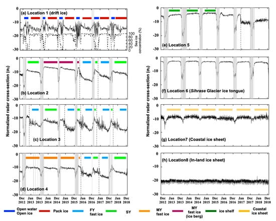 Figure 3 shows the time series of σ0 at eight locations, as shown in Figure 1, indicated by a solid line, and the surface melting determined from the XPR is indicated by a gray shading. The dashed line in Figure 3a shows the SIC. It should be noted that the time series data are not values averaged over the circles, but those from a satellite image pixel at their center, as shown in Figure 1. Analyzing the MODIS imagery and the Sentinel imagery across multiple years, the ice conditions were investigated at each location. The resulting ice types are indicated here by horizontal bars over the period of their existence. These bars also show the time periods extracted to calculate the thresholds for classifying each ice type. The types of ice are shown in the lower legend of Figure 3. The behavior of σ0 during melting is explained in the next subsection.