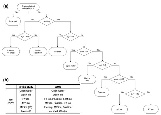 (a) Workflow for the ice classification algorithm based on the σ0 values, brightness temperature (TB), and sea ice concentration (SIC) data. (b) Table summarizing the different ice types defined in this study and the WMO’s defined ice types. FY: First-year; MY: Multi-year; IB: Iceberg; SY: Second-year. XPR: Cross-polarization ratio.