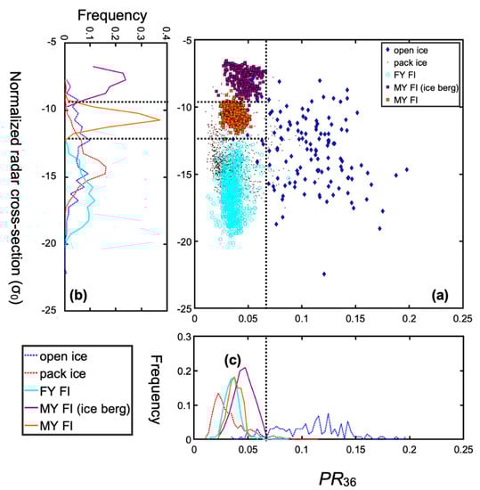 (a) Scatterplot of σ0 and PR36. Blue diamonds indicate open water and open ice, respectively. Brown dots indicate pack ice. Light blue circles indicate FY fast ice, and purple or orange squares indicate MY fast ice, including icebergs and MY fast ice, respectively. (b),)c) Histograms of σ0 and PR36, respectively. The dotted line shows the threshold of the ice classification algorithm.